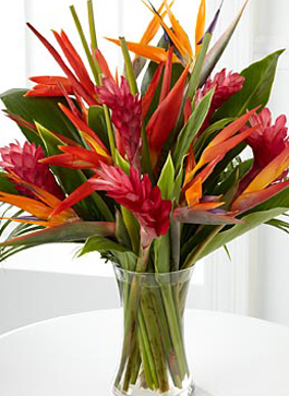 Included in this fresh Bouquet are Red Ginger Stems, Birds of Paradise and Tropic Fleur. Foliage included