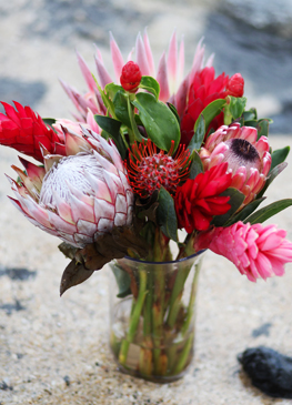 This vibrant red and Pink Tropical Flower Bouquet will have you dreaming of the beautiful Hawaii. It's filled with Tropic Protea and Ginger.